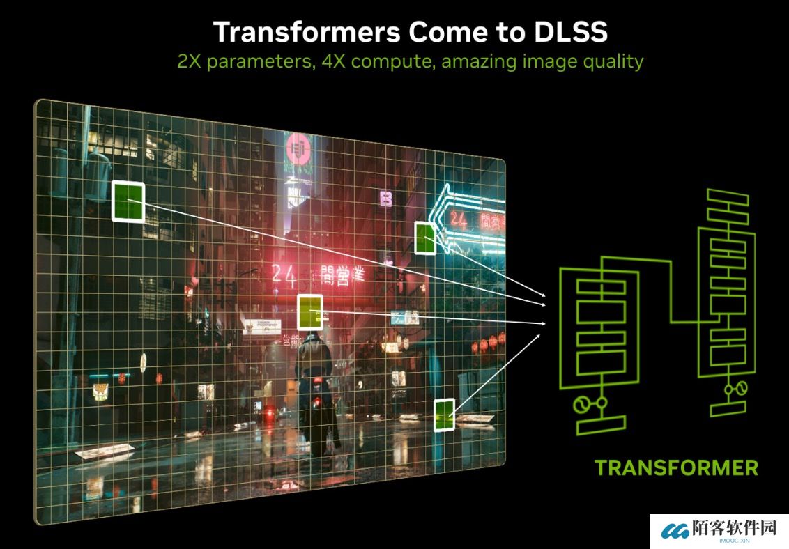 DLSS 4 技术还带来了模型架构的重大升级,DLSS 光线重建、DLSS 超分辨率和 DLAA 特性均由首个实时 Transformer 模型驱动,并用来提升生成像素的质量,它支持通过自注意力操作评估整个帧几多个帧中每个像素的重要程度,更好理解场景关系,让生成的像素具有更好稳定性、更少的伪影、更丰富的运动细节和平滑边缘。