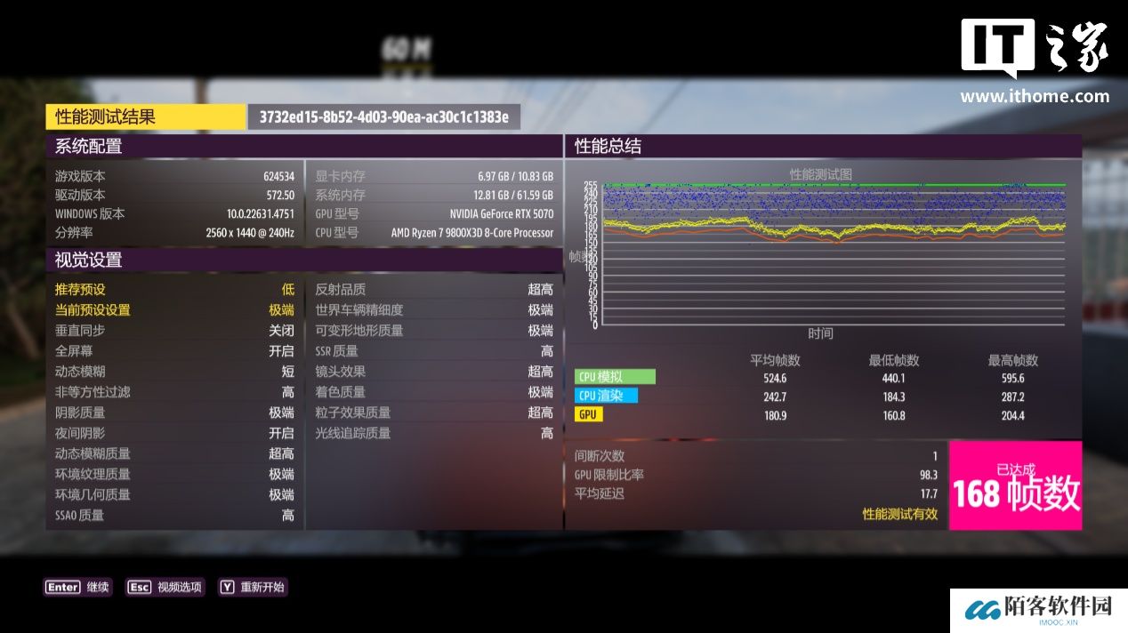 RTX 5070 在 2K 分辨率 + 最高画质 + DLSS 质量模式下,游戏平均帧数为 168 帧,1% Low 帧 118 帧,平均延迟 27ms;