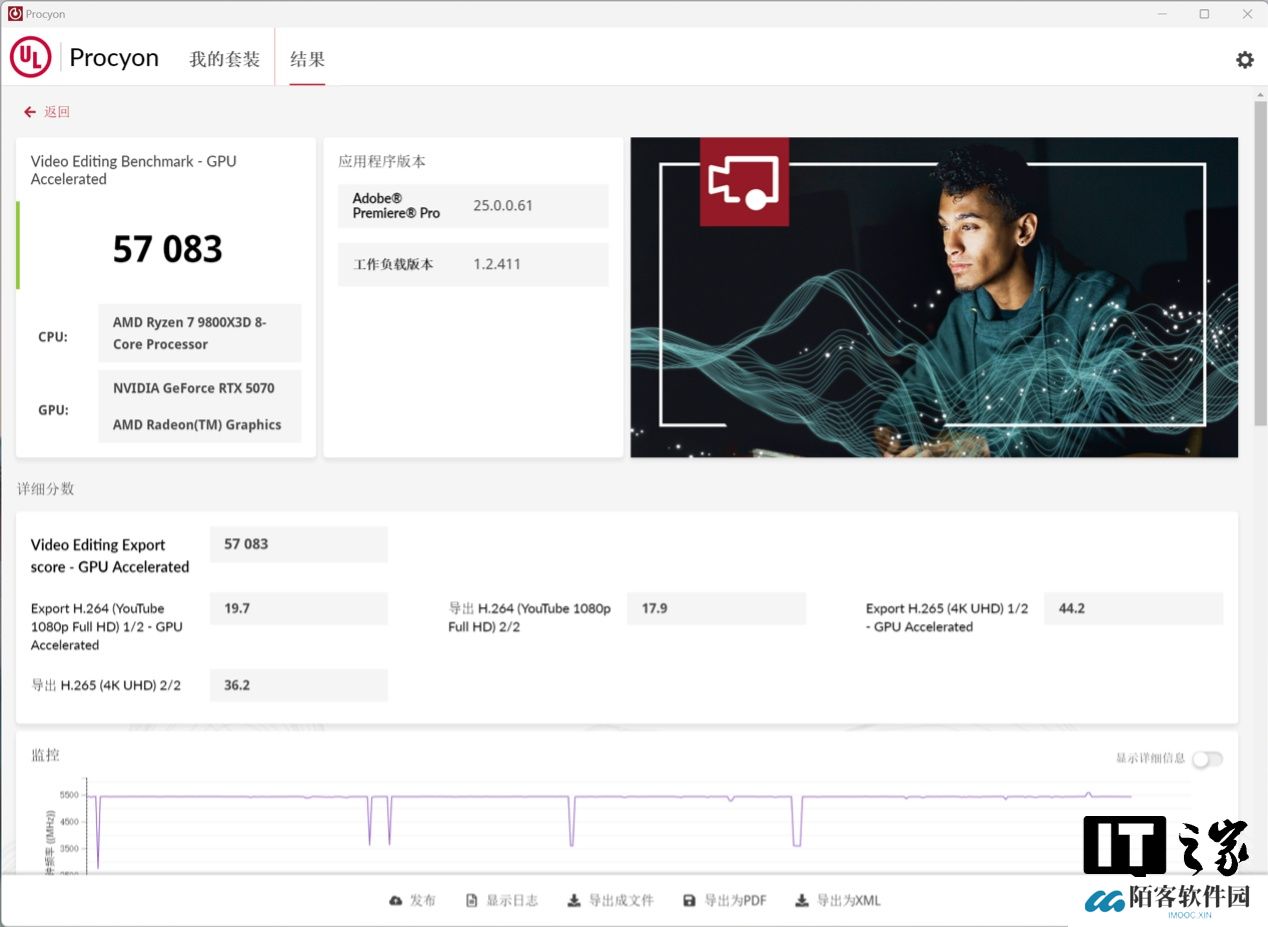 在 UL Procyon 的视频剪辑性能测试项目中,GPU 加速,得益于 Blackwell 架构升级的第九代 NVENC 编码器和 NVDEC 解码器,其在 H.264 / H.265 4:2:2 编码的 8 位和 10 位视频上有着非常大的优势,经过实测: