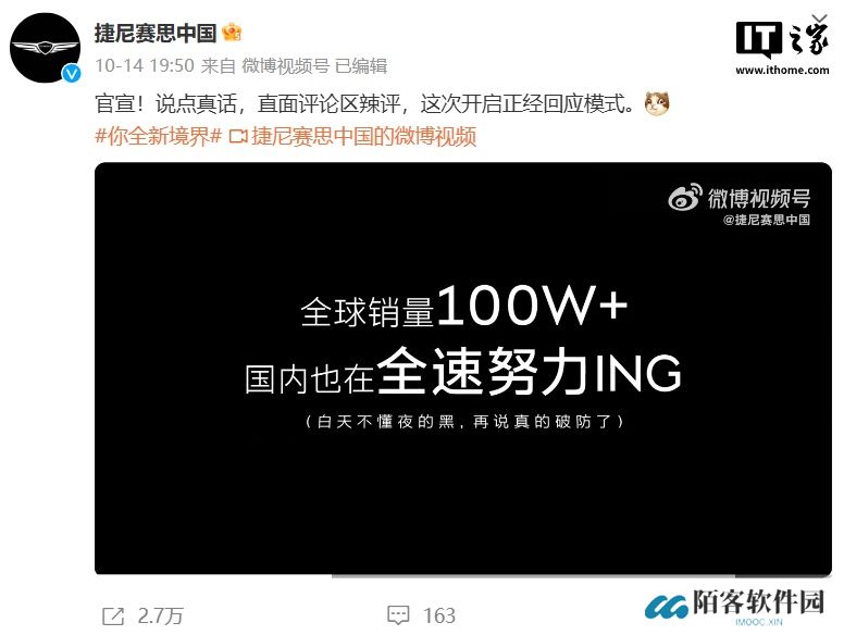 捷尼赛思作为一个豪华汽车品牌,在中国市场的知名度和销量一直不是很高,甚至官方也曾玩梗表示“再说真的破防了”。