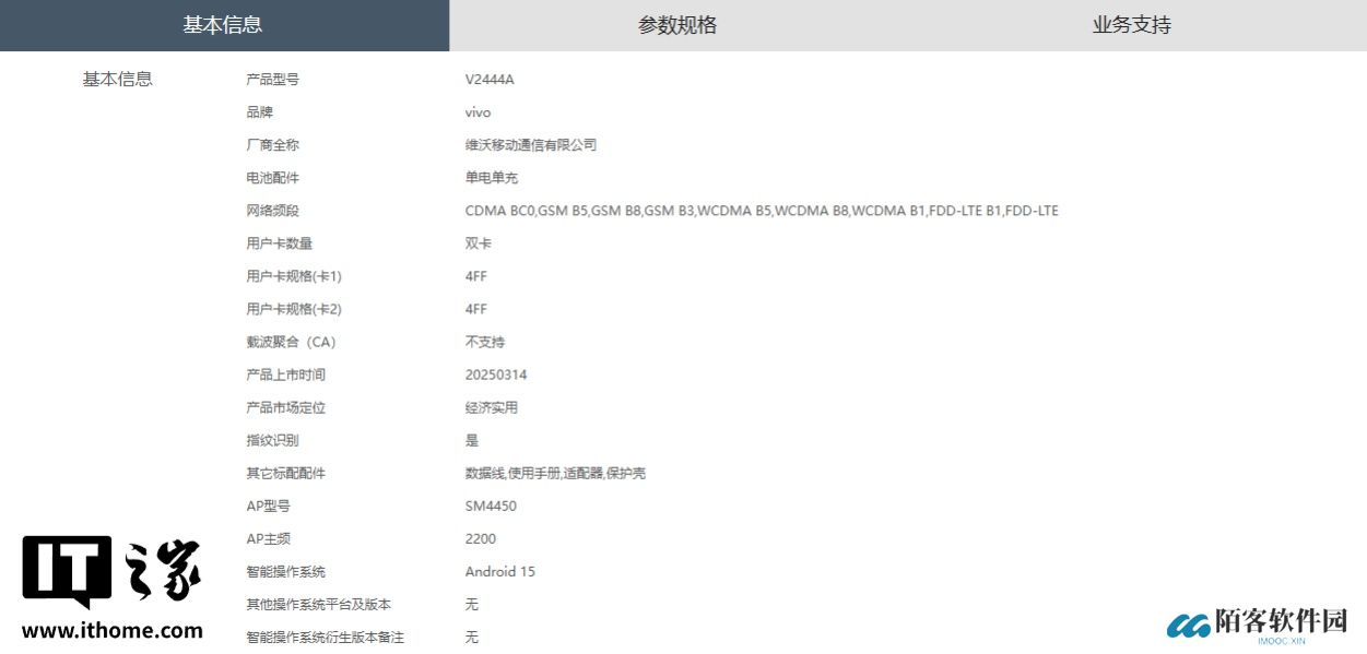 vivo Y300i 手机产品型号为 V2444A,市场定位“经济实用”,预装 Android 15 系统。新机尺寸为 165.70×76.30×8.09mm、重约 205g,分辨率 1608*720,内置 6500mAh 电池。
