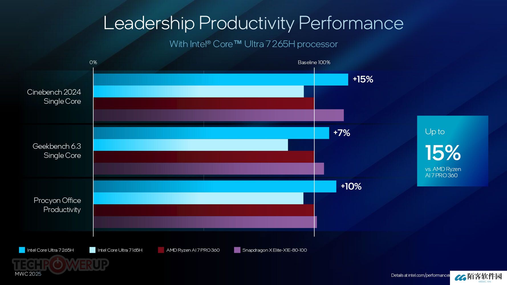 至于竞争对手的性能,英特尔表示 Ultra 265H 超越了骁龙 X Elite-X1E-80-100,并且在 Cinebench 2024 单核测试中比 AMD 锐龙 AI 7 PRO 360 强了 15%。