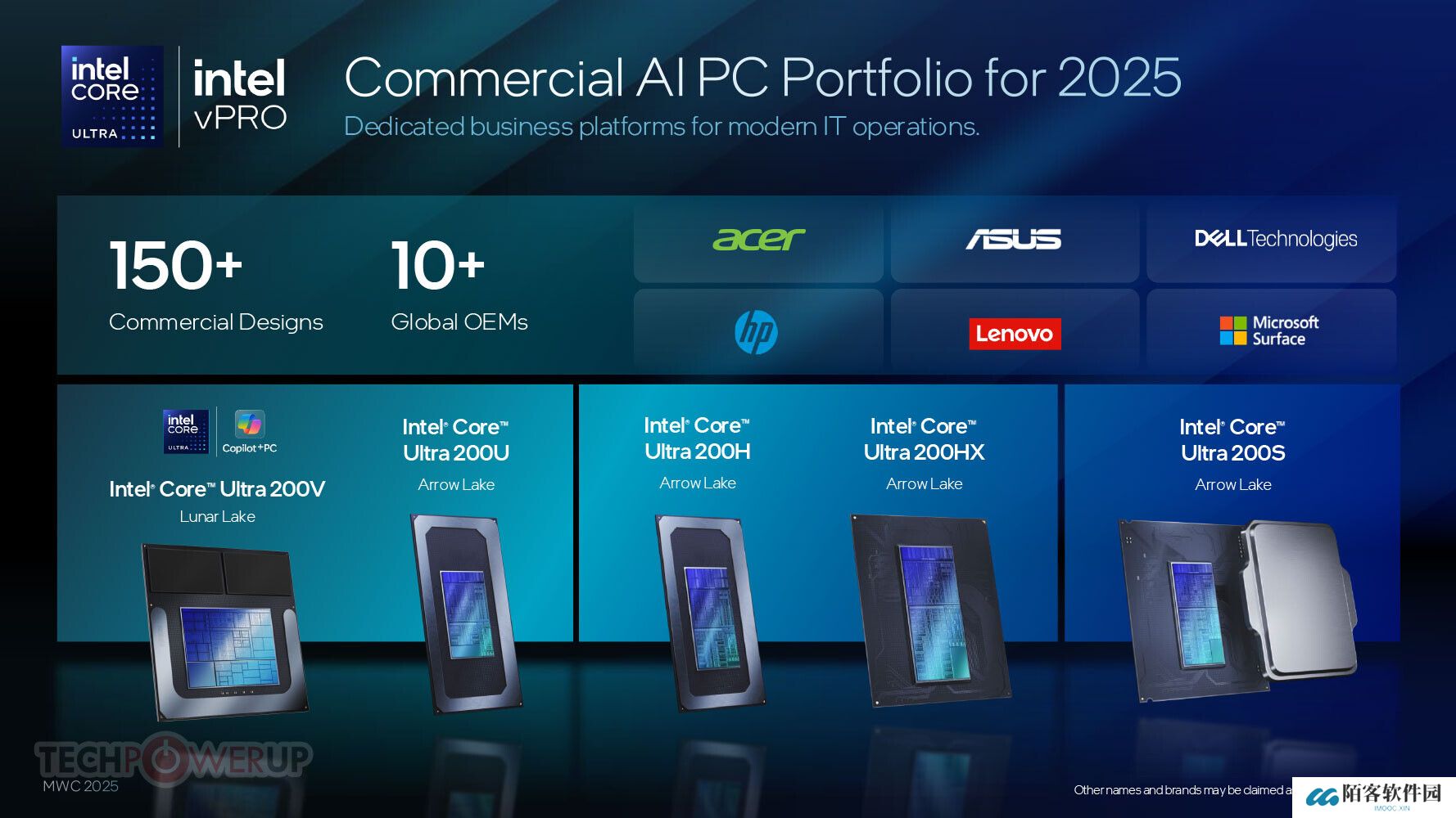 本站 3 月 6 日消息,英特尔在 2025 年世界移动通信大会上发布了商用 AI PC 产品(vPro 博锐)阵容,包括酷睿 Ultra 200V、200U、200H、200HX 和 200S 系列处理器。