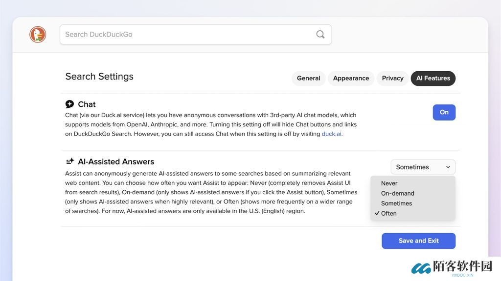 本站 3 月 7 日消息,Spread Privacy 官网昨日(3 月 6 日)发布公告,宣布 DuckDuckGo 搜索引擎的 AI 功能已告别 Beta 测试阶段,现已正式上线,用户可自由选择是否启用 AI 辅助搜索和聊天功能。