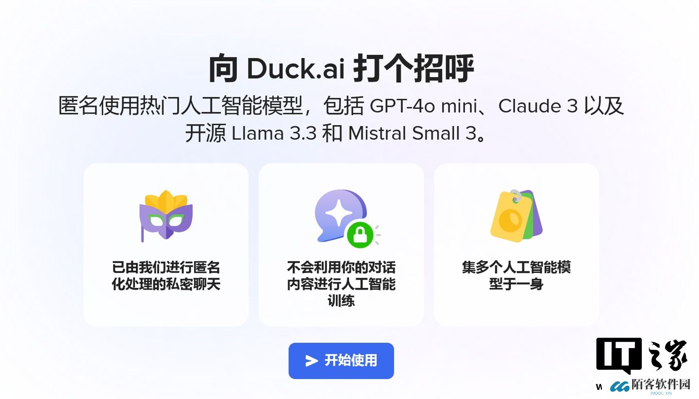本站援引博文介绍,官方还同步上线了 Duck.ai 网站,提供免费、私密的 AI 聊天服务,无需账户即可使用,且聊天内容不会用于 AI 模型训练。