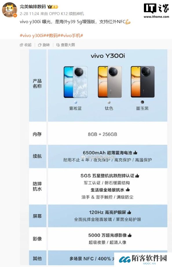 本站 3 月 6 日消息,vivo 昨日官宣 Y300i 手机将于 3 月 14 日开售,搭载“全面抗摔金刚盾玻璃屏”。今日,vivo 官方公布了这款新机的外观,提供雾凇蓝、钛色以及黑色三款配色,后置居左圆形相机模组。