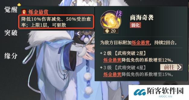 丁夏的天赋也是队友在对受到“商海奇袭”绝技debuff影响的敌人攻击时,丁夏会对该目标额外造成一定的法术伤害。突破技“筹算乾坤”,每造成3次直接或者间接伤害,可以额外提供70%(100%)的增伤。