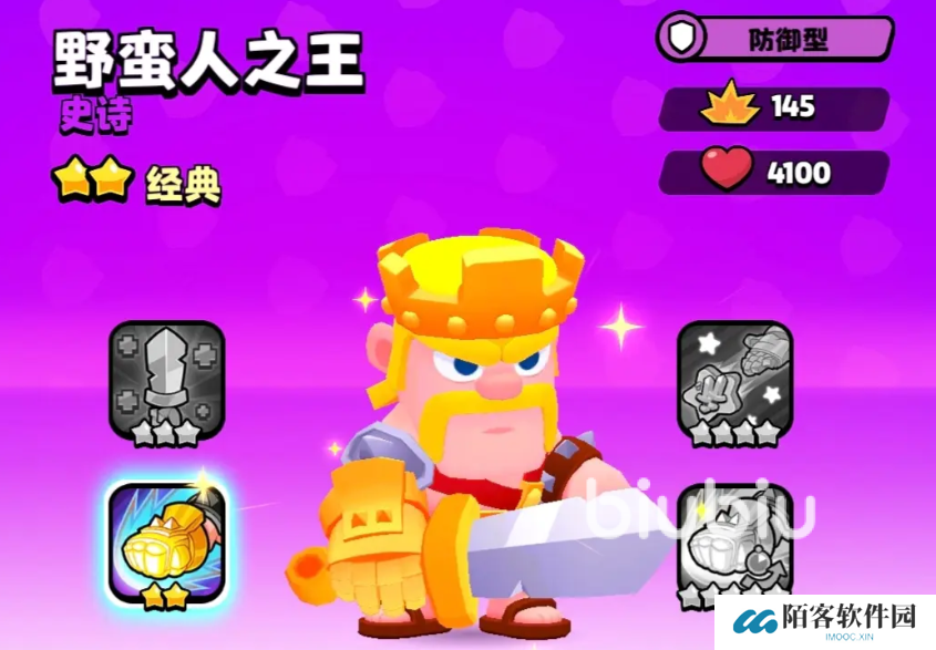 他拥有超高的血量和攻击力,对于哪些不爱发育,就想不断战斗,依靠强大武力击杀夺取其他人钻石和金币的玩家而言,绝对是首选的主力,初始能力是提升23%小队近战成员的攻击速度,2星会每过10秒打出蓄力铁拳,形成240点范围伤害加击退,3星会在不攻击时,每3秒回复240点的生命值,4星会为队伍提供一个超级狂暴法术,从而更频繁的使用蓄力铁拳。