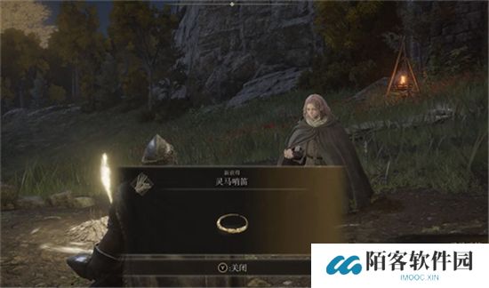 1、首先,玩家从新手出生点,来到下图所示位置,我们在篝火旁坐下来,会出现女主角【梅琳娜】,她会给你一个【灵马哨笛】戒指。