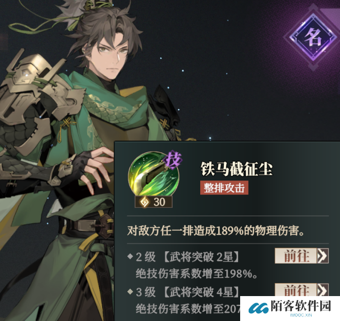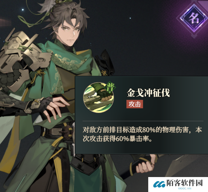 关平是关羽之子,从目前的情况来看,关平是一位名将。这个稀有度的武将是属于中坚力量,玩家们使用得当的话基本上用到后期是没有问题的。他的通用技能是破甲。这个技能可以让关平获取到20%无视防御,只可以叠加一层,可以被驱散,此技能的持续时间是1回合。