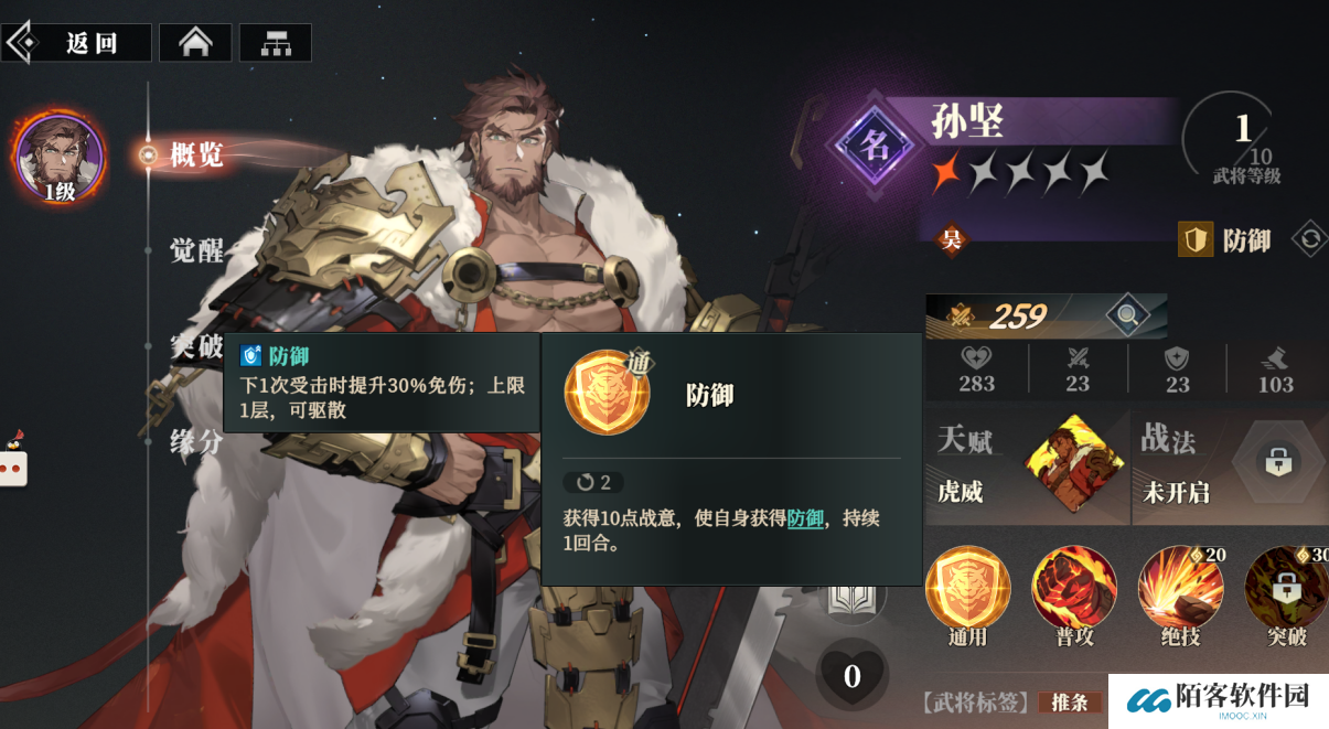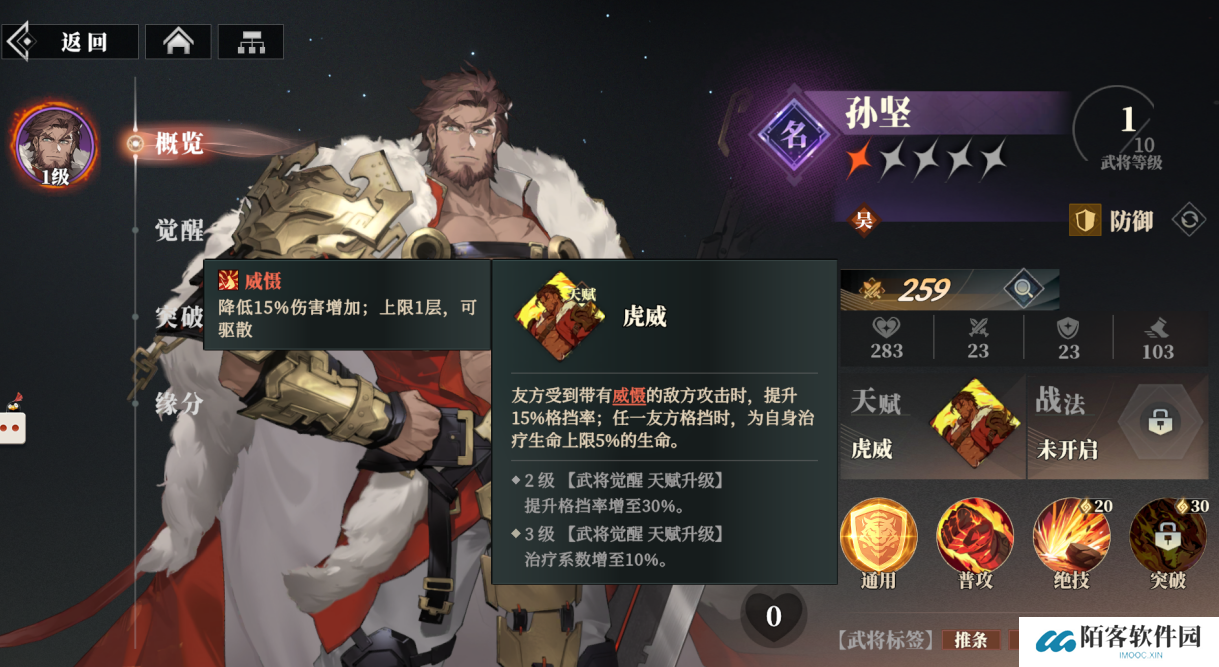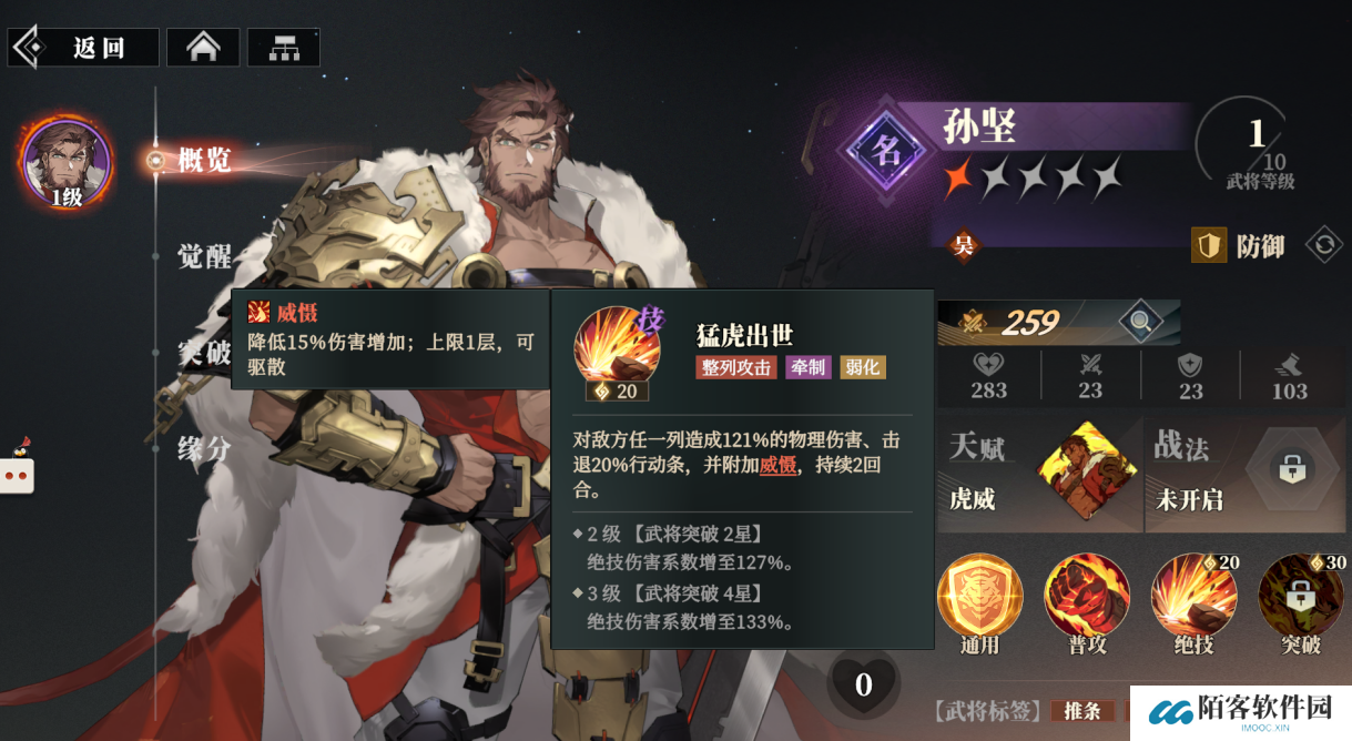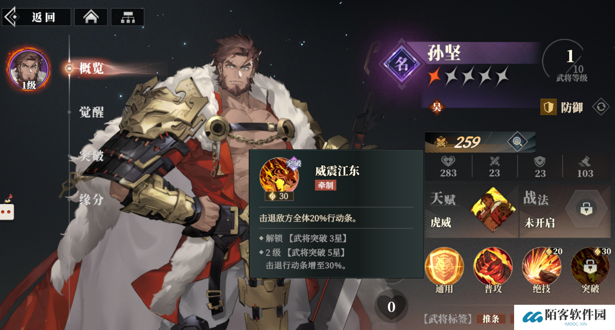 突破4星升到3级会让伤害增加到133%,他的突破技“威震江东”在释放以后会击退敌方20%的行动条,玩家把武将突破到5星解锁到2级后,还会让这个行动条的击退进度增加到30%。