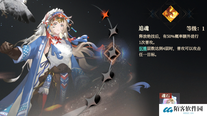 再看看邹翊的突破技“追魂”,在使用绝技后会有50%概率进行额外一次普攻,如果驭雕的层数达到4层普攻可以攻击任一目标。武将突破5星的时候可以达到100%概率。这里的“驭雕”是通过天赋获取的被动效果,能给普攻增伤,最多能叠6层。