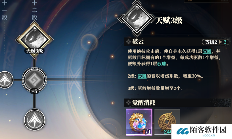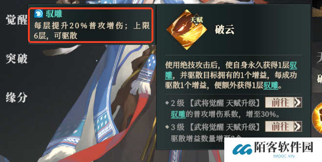 接下来就看天赋了,邹翊的天赋“破云”,是在使用绝技后自身获得1层驭雕buff,每层提供20%普攻伤害增益,同时还可以驱散一个目标敌人身上的增益,每成功驱散1个都可以获得1层驭雕buff。