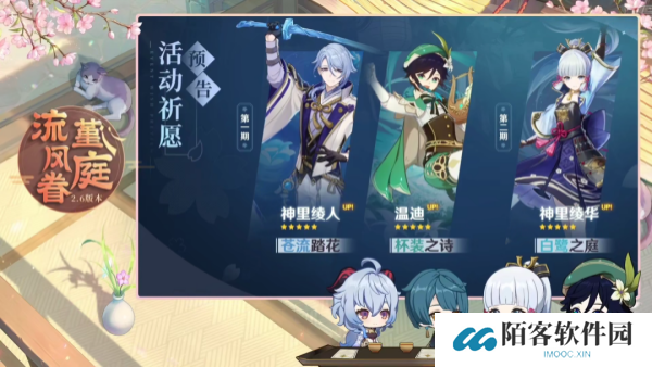 2.6版本UP池可能有:神里绫华、鹿野院平藏、神里绫人、宵宫这四个角色,分两期上线。其中鹿野院平藏是一个新出的五星角色,大家感兴趣的话,可以届时获取到他哦。除此之外3月底还有一个末风花节的活动,大家届时还可以获取温迪、万叶的双复刻池,大家如果还没有获取到她们的话,记得记得及时登录游戏进行抽取哦!