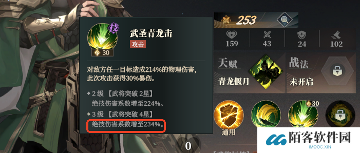 普攻前排单体100%倍率物伤,平平无敌。重点是看绝技,关羽的绝技“武圣青龙击”,则可以对敌方任一目标造成214%(4星升至234%)倍率的物伤,并且这次攻击还会获得30%暴伤加成。