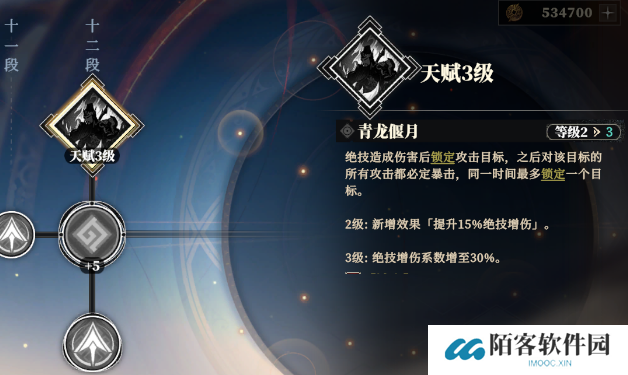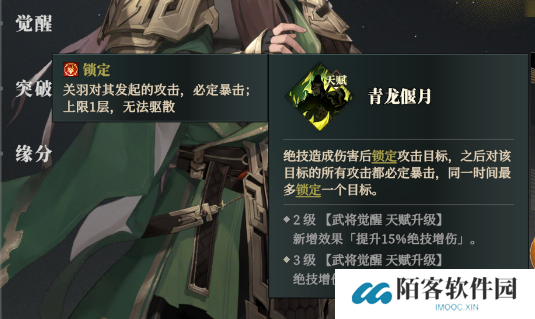 关羽的突破技“威震华夏”则是在攻击锁定目标的时候,可以驱散目标3个增益,突破5星解锁每成功算一个增益,提升10%自身行动条。那么大家一定很好奇,这个锁定是如何判定的,这里就不得不提到关羽的天赋“青龙偃月”了。