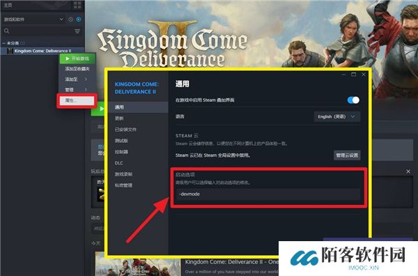 右键点击Steam库中的天国拯救2,选择“属性”。